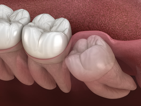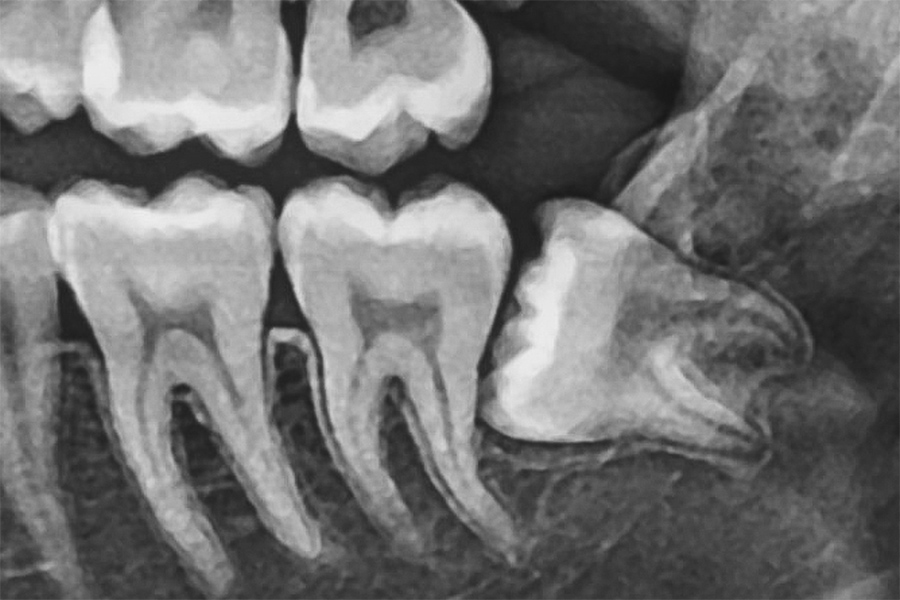 横向きに生えている「水平埋伏歯」は、手前の歯を圧迫することで痛みや歯並びの乱れを引き起こし、虫歯や歯周病の原因になることがあります。