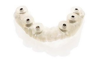 シミュレーションソフトが導き出したデータから、「サージカルガイド」を作製します。サージカルガイドは、穴の開いたマウスピースのような形状の手術サポート装置です。手術の際は患者さんのお口にサージカルガイドを装着し、サージカルガイドの穴に合わせてインプラントを埋入していきます。